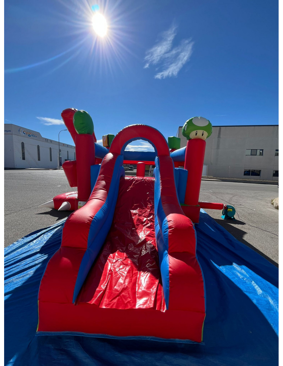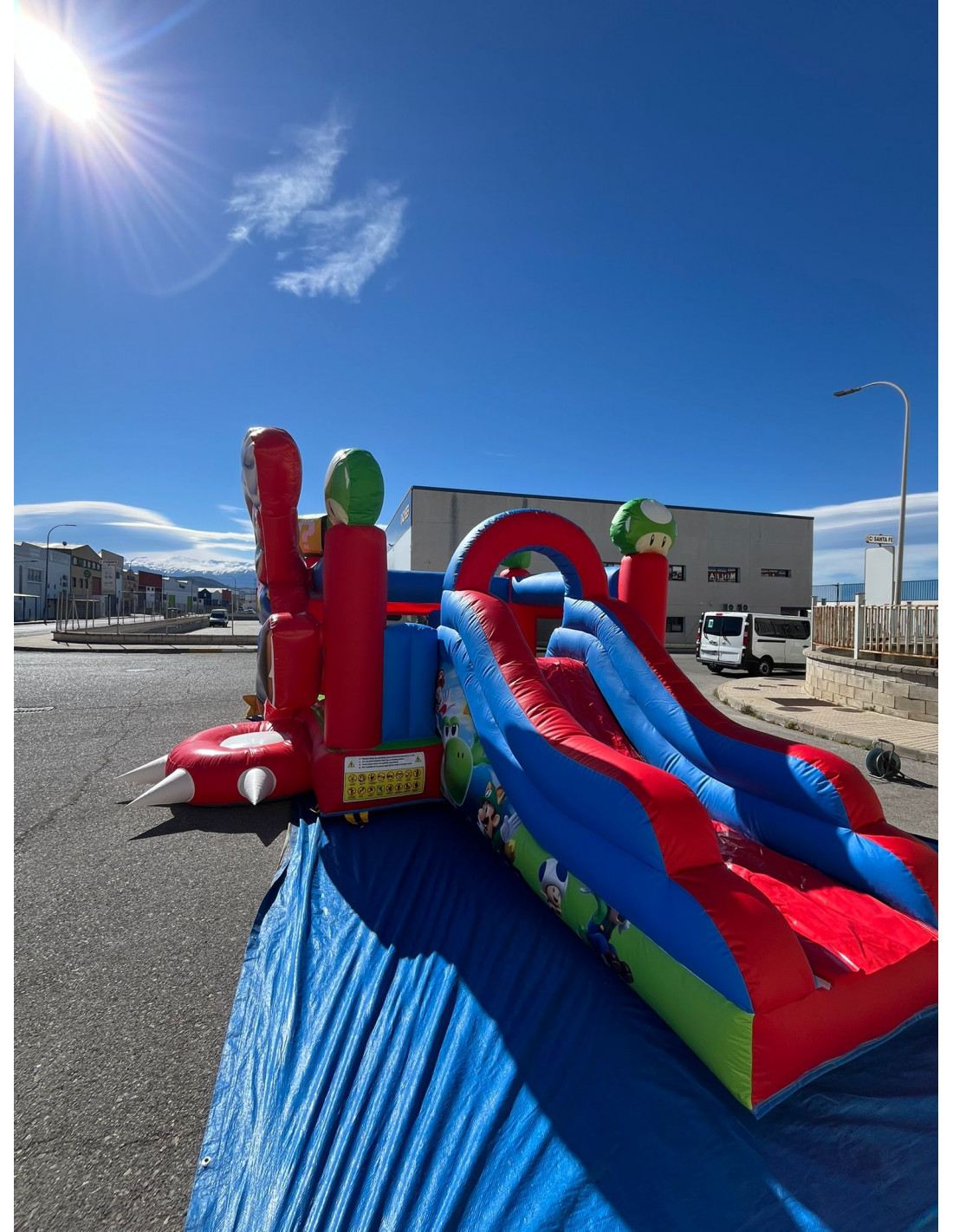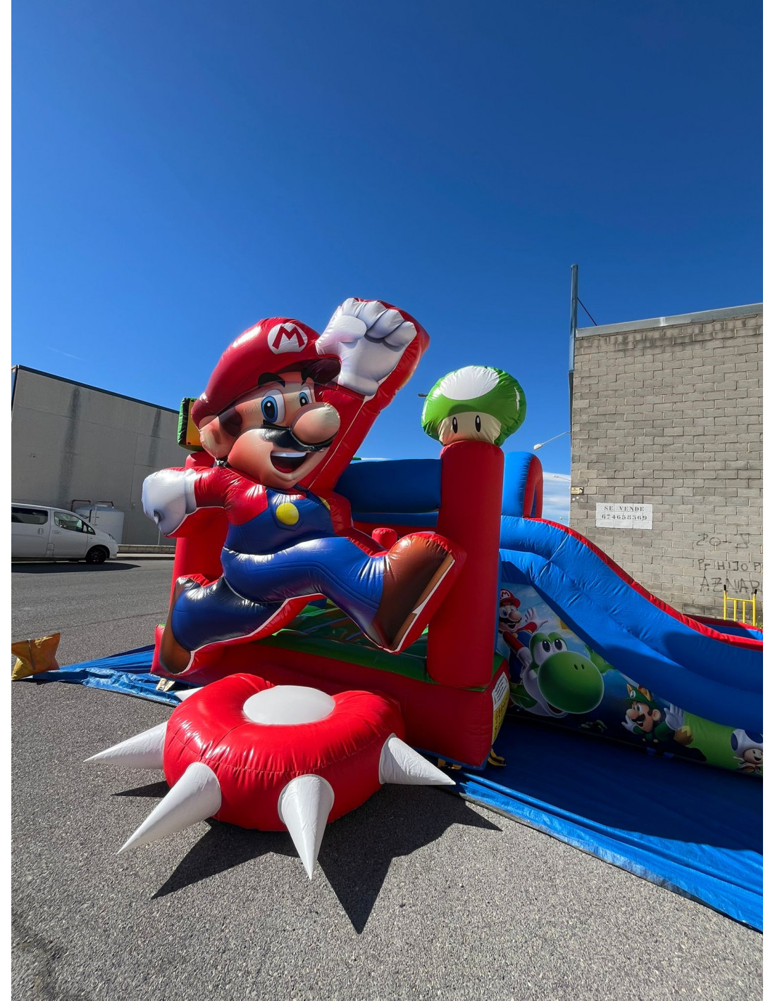 Alquiler castillo hinchable Mario Bros. Precio de alquiler por dia. Oferta especial fin de semana 2 dias por el precio de 1 dia. Transporte y montaje a consultar. Se cobra una fianza de 130€. Ideal para niños hasta 12 años. Capacidad 6-7 niños. Turbina, manta y contrapesos incluido en el precio. 6 m largo por 5 m ancho por 3,20 m alto.